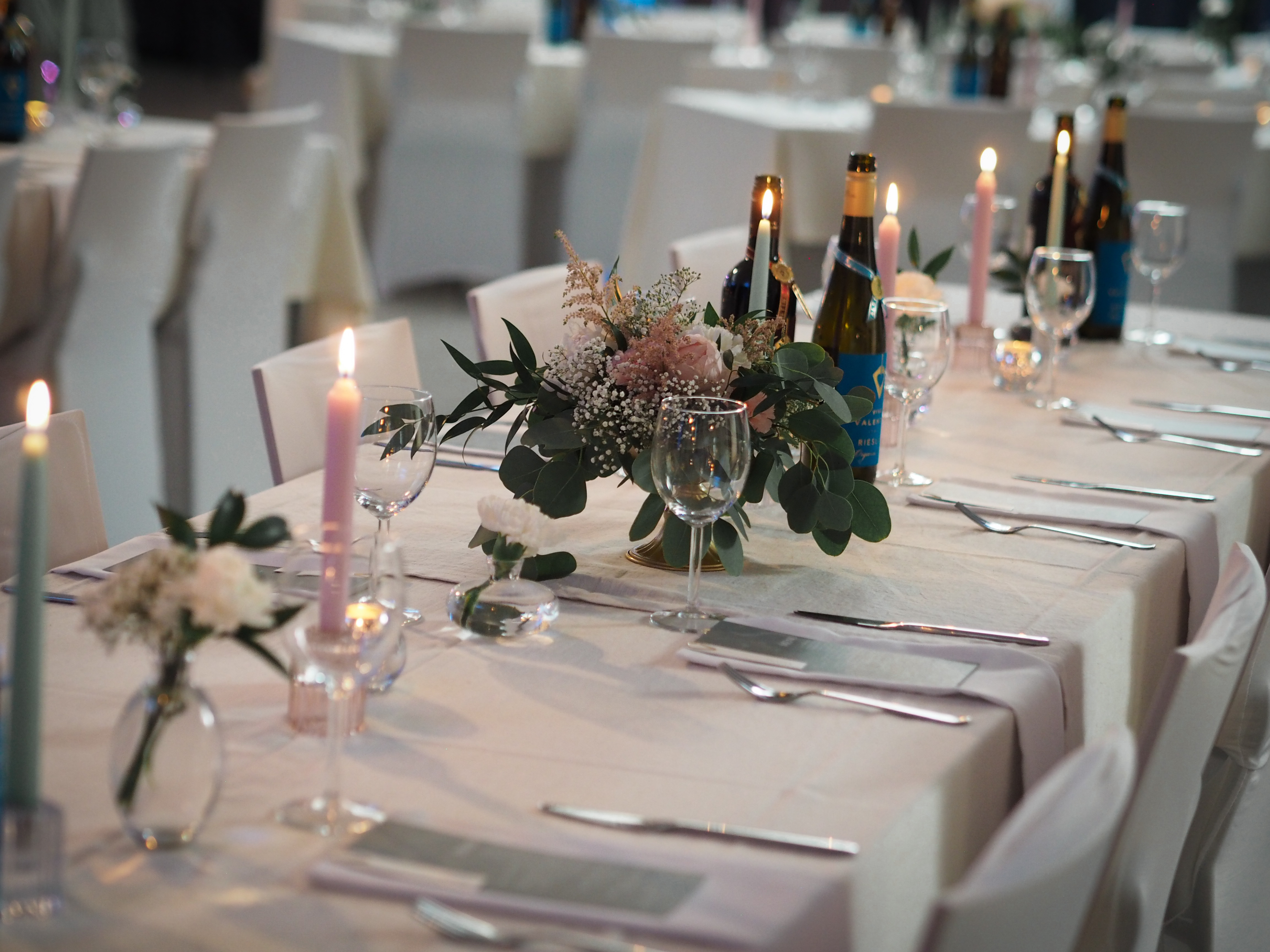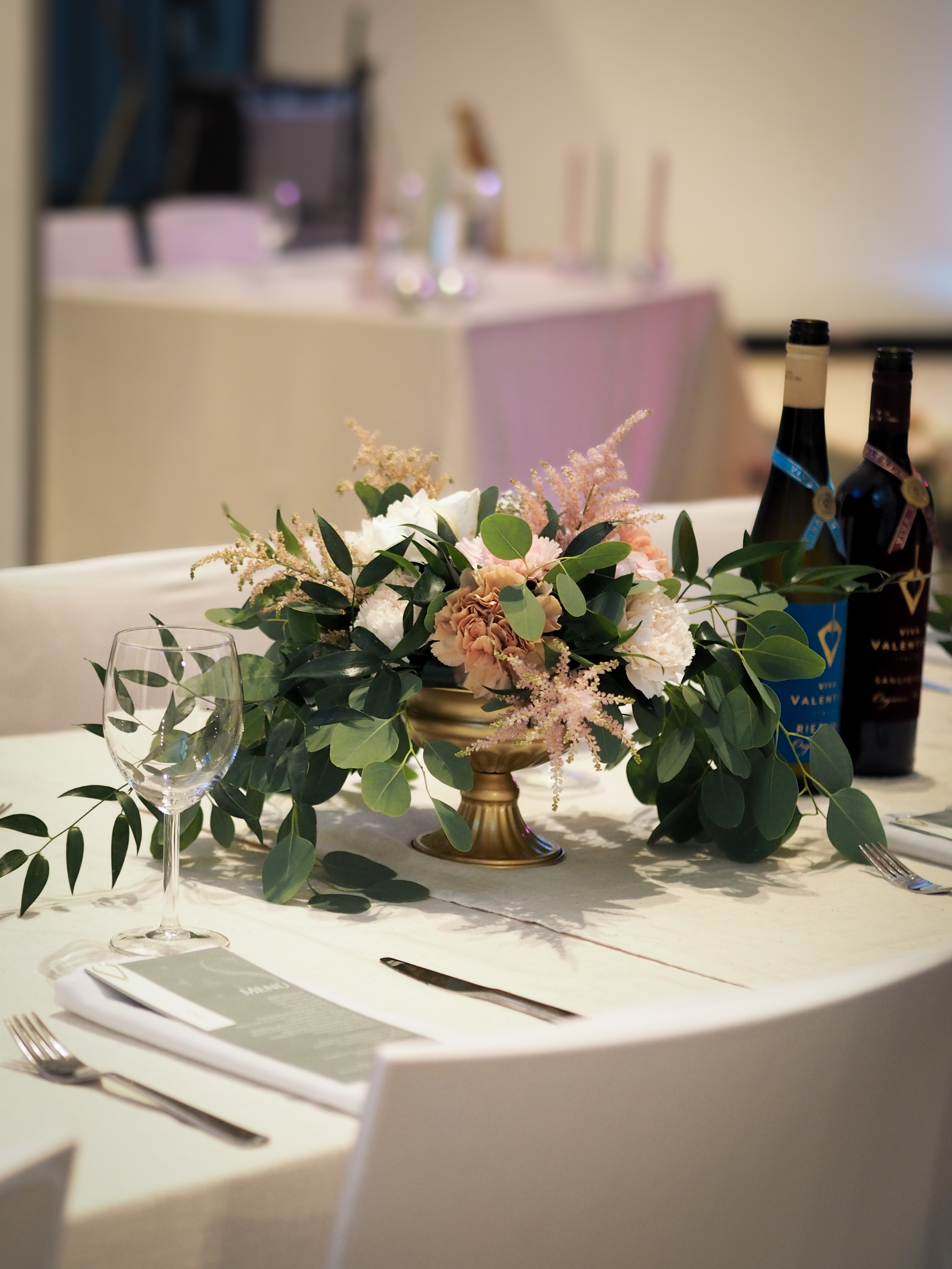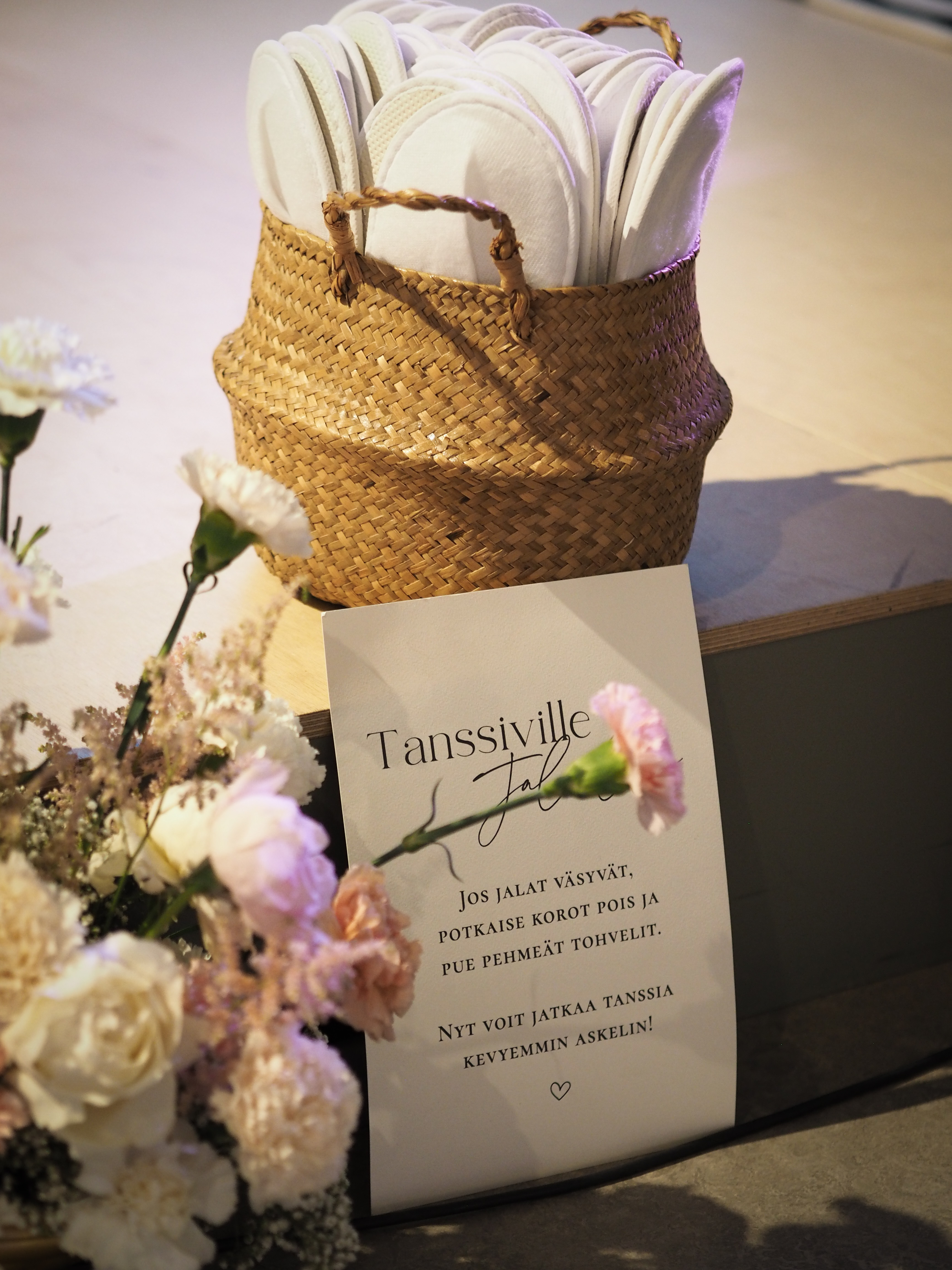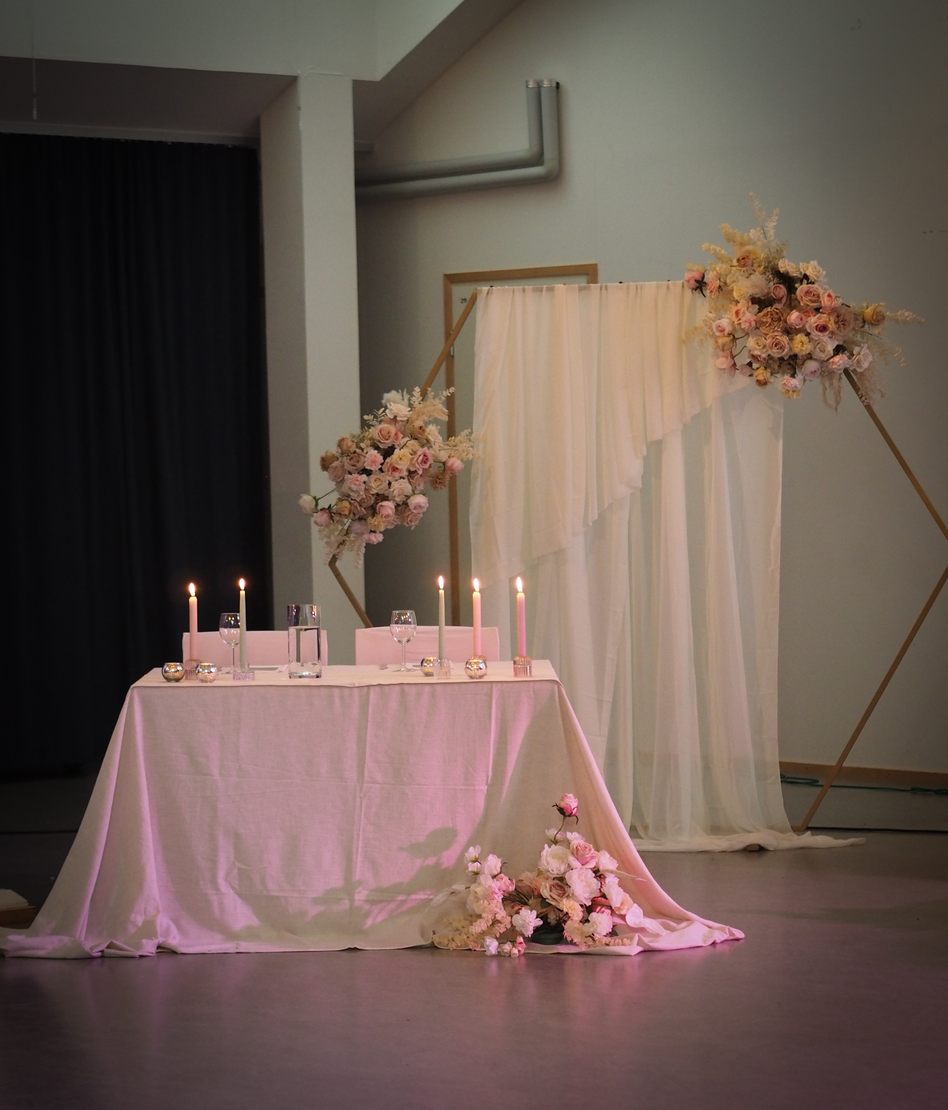 Jokioisten Tietotalon kauniiseen juhlatilaan luotiin pastellinsävyinen somistus. Luonnonmukainen kukkaisteema eli läpi juhlasalin, ja kuvausseinän herkkä leijuvat kukat-installaatio toivotti vieraat tervetulleeksi.