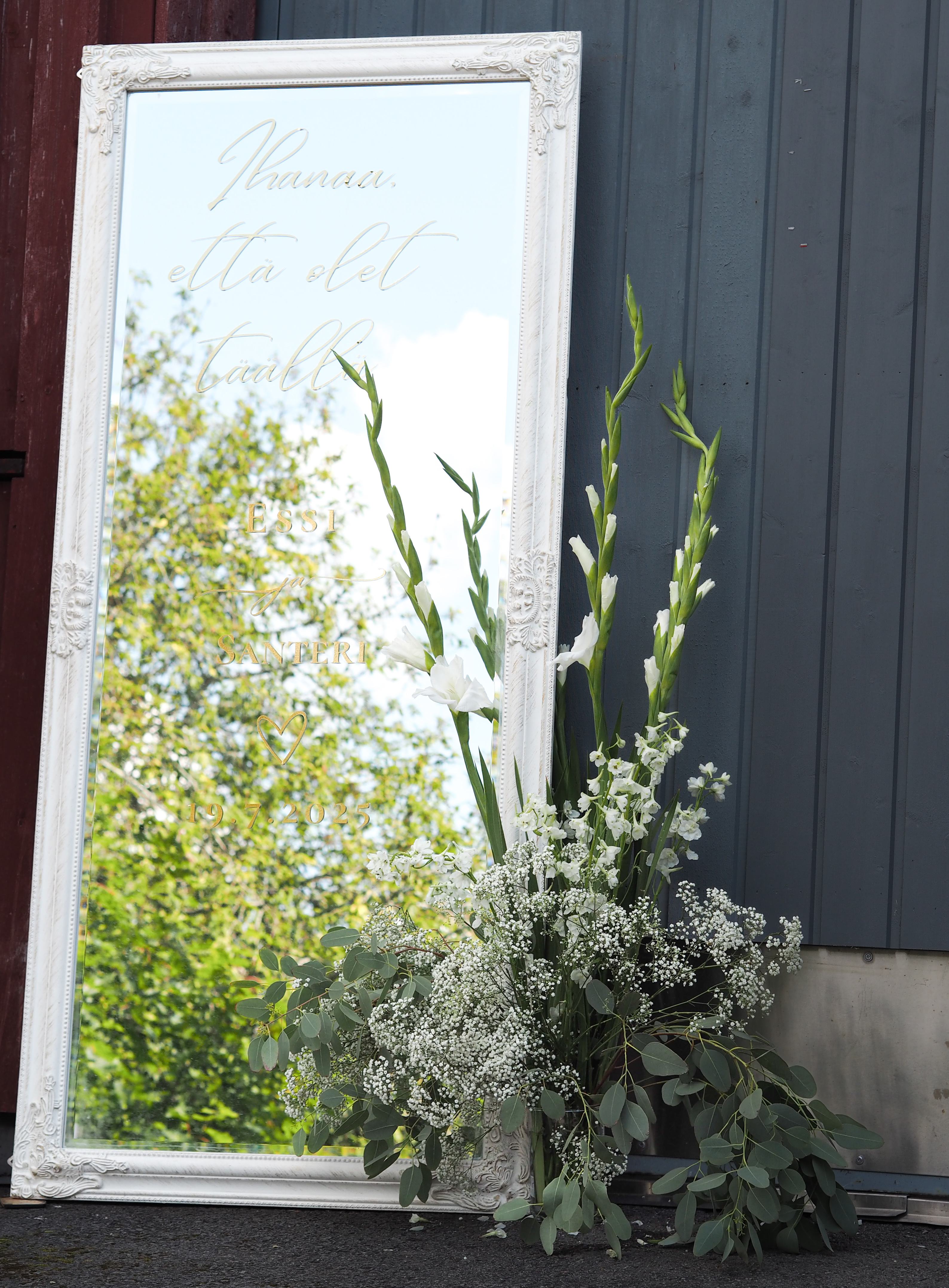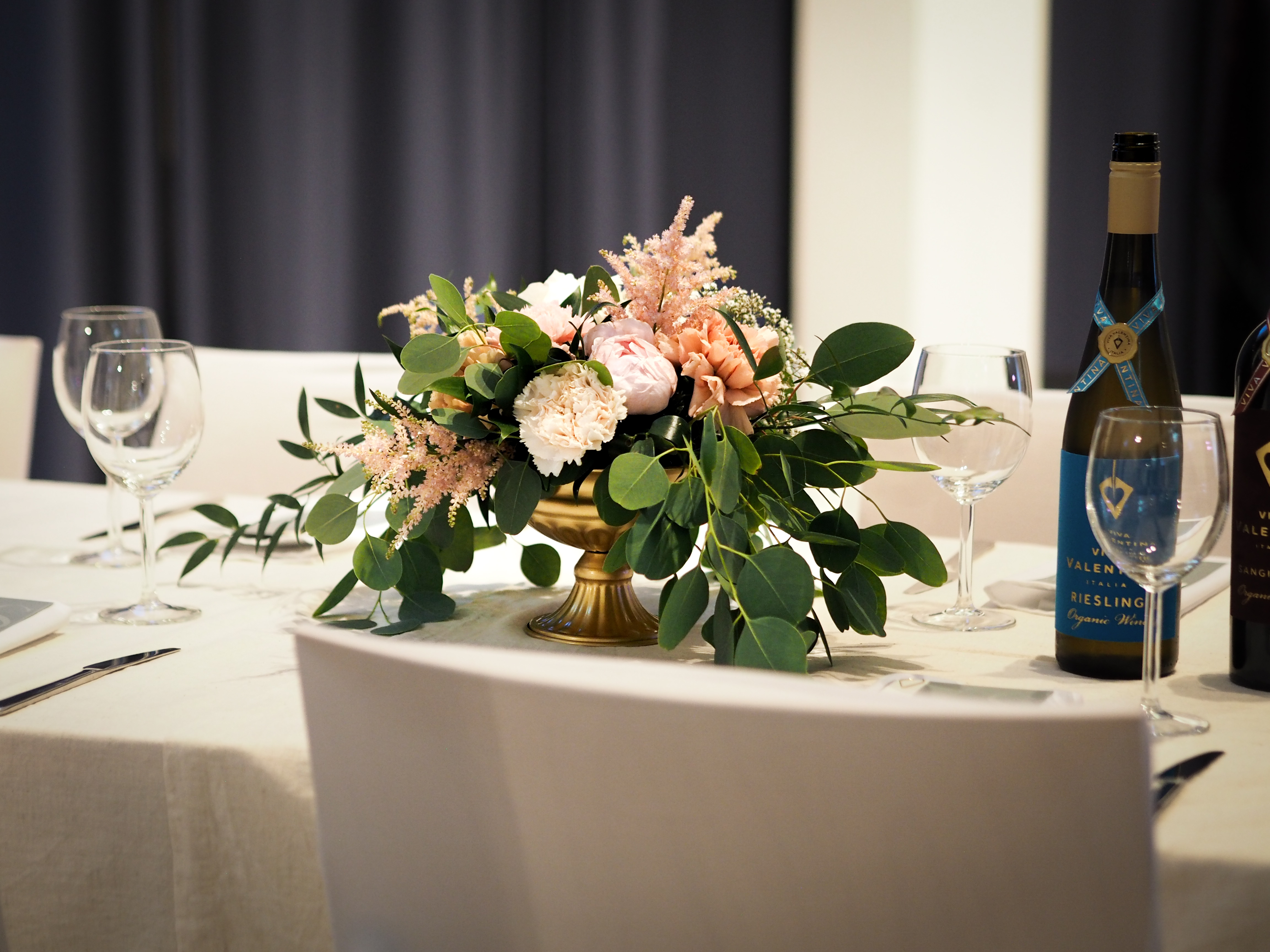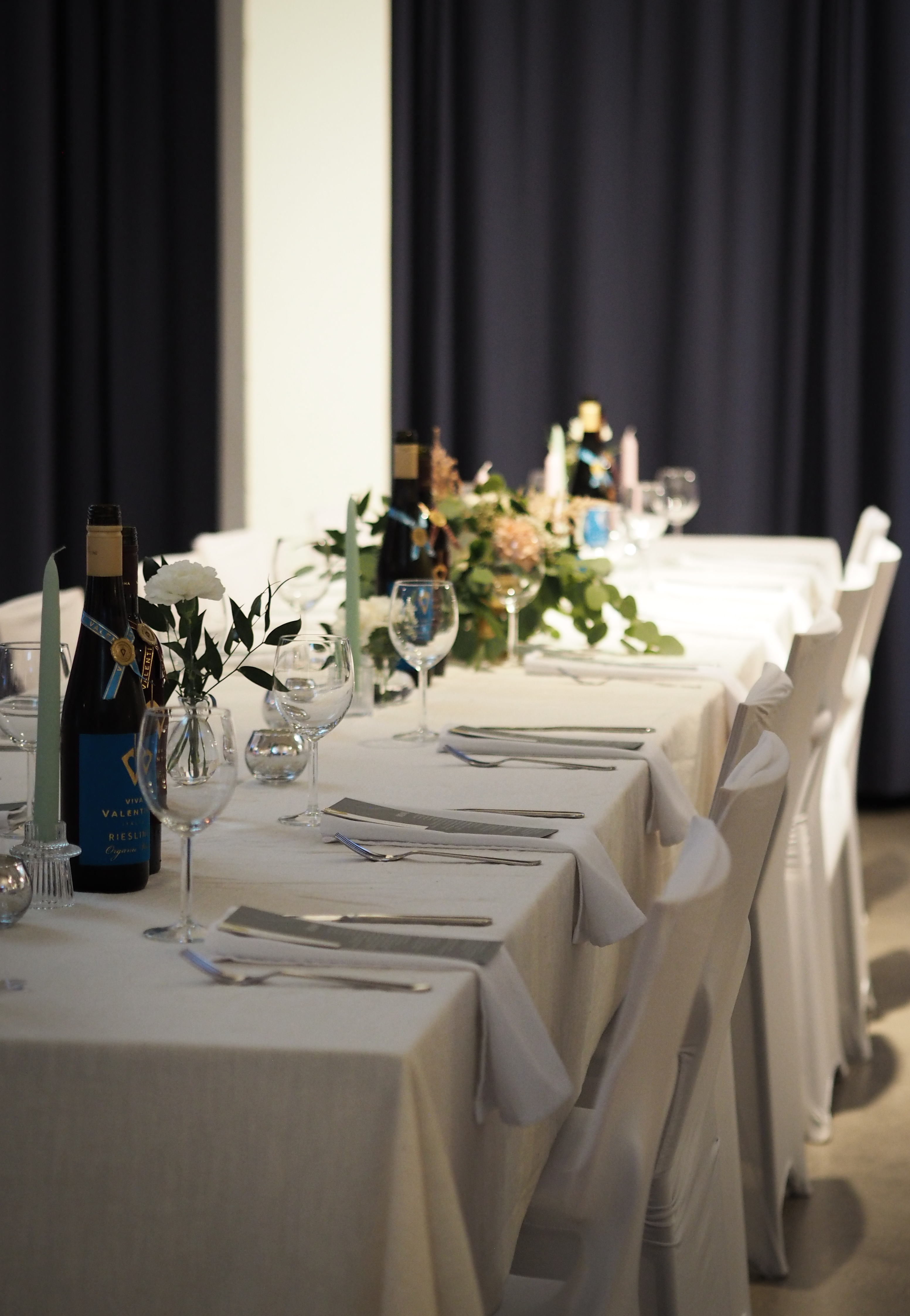 Jokioisten Tietotalon kauniiseen juhlatilaan luotiin pastellinsävyinen somistus. Luonnonmukainen kukkaisteema eli läpi juhlasalin, ja kuvausseinän herkkä leijuvat kukat-installaatio toivotti vieraat tervetulleeksi.