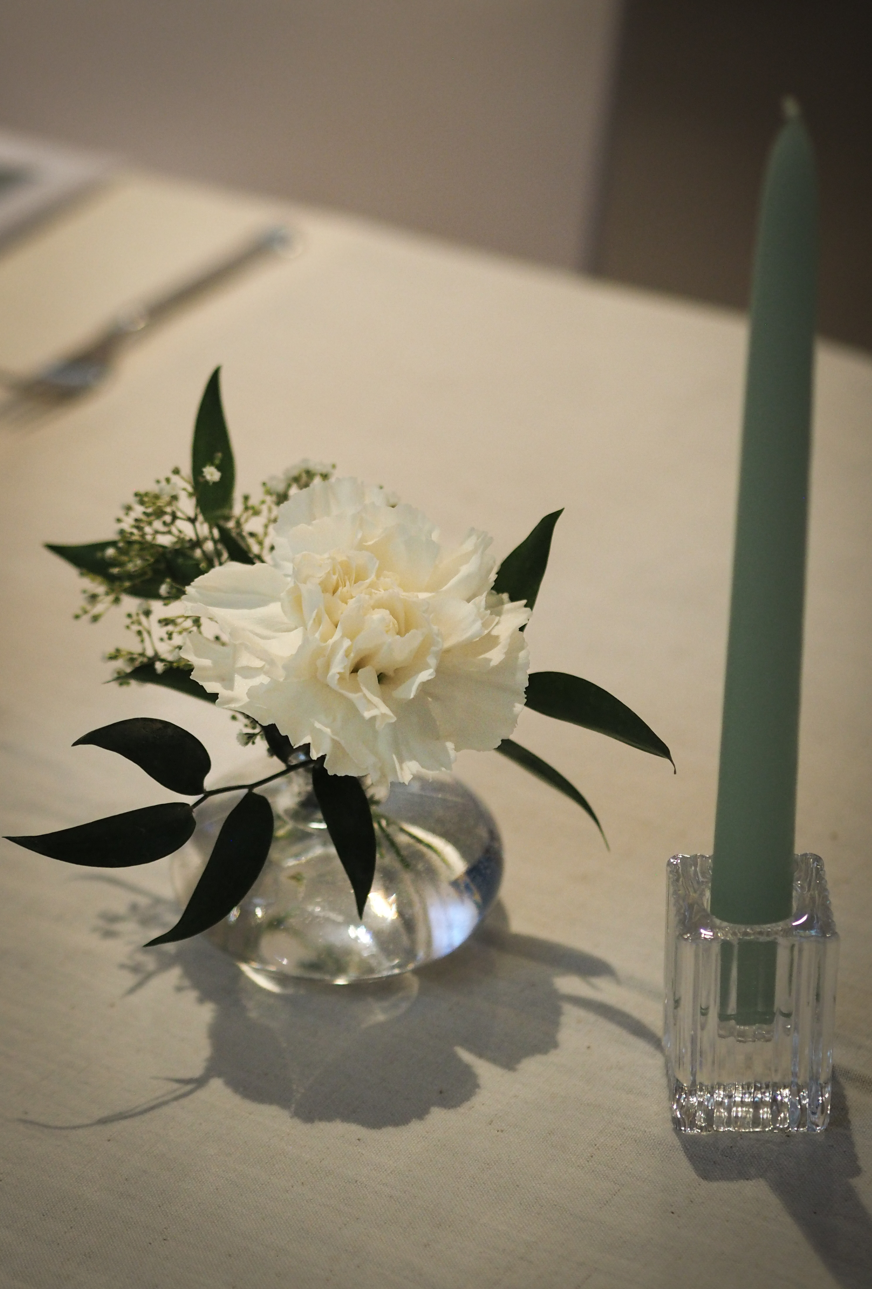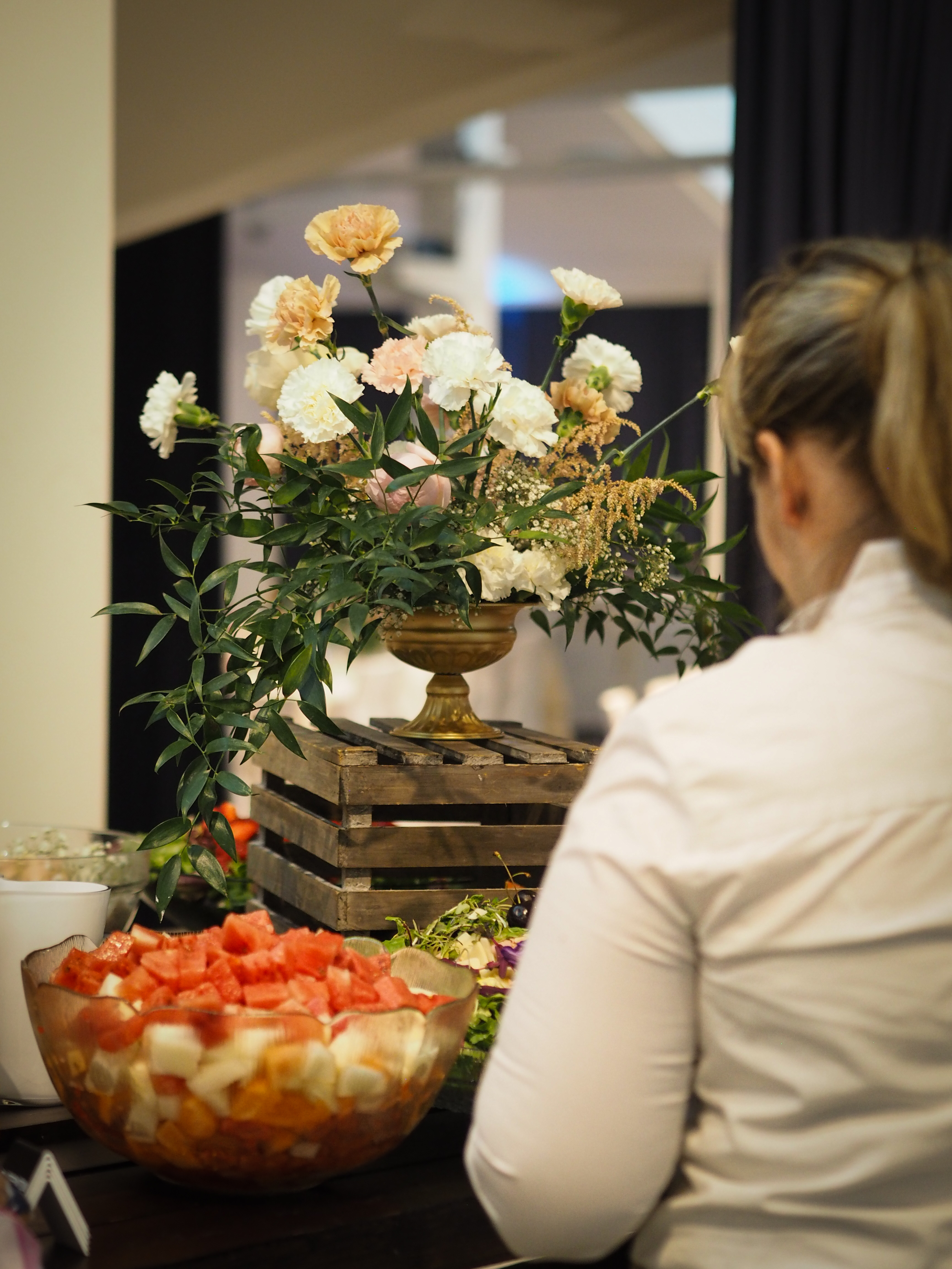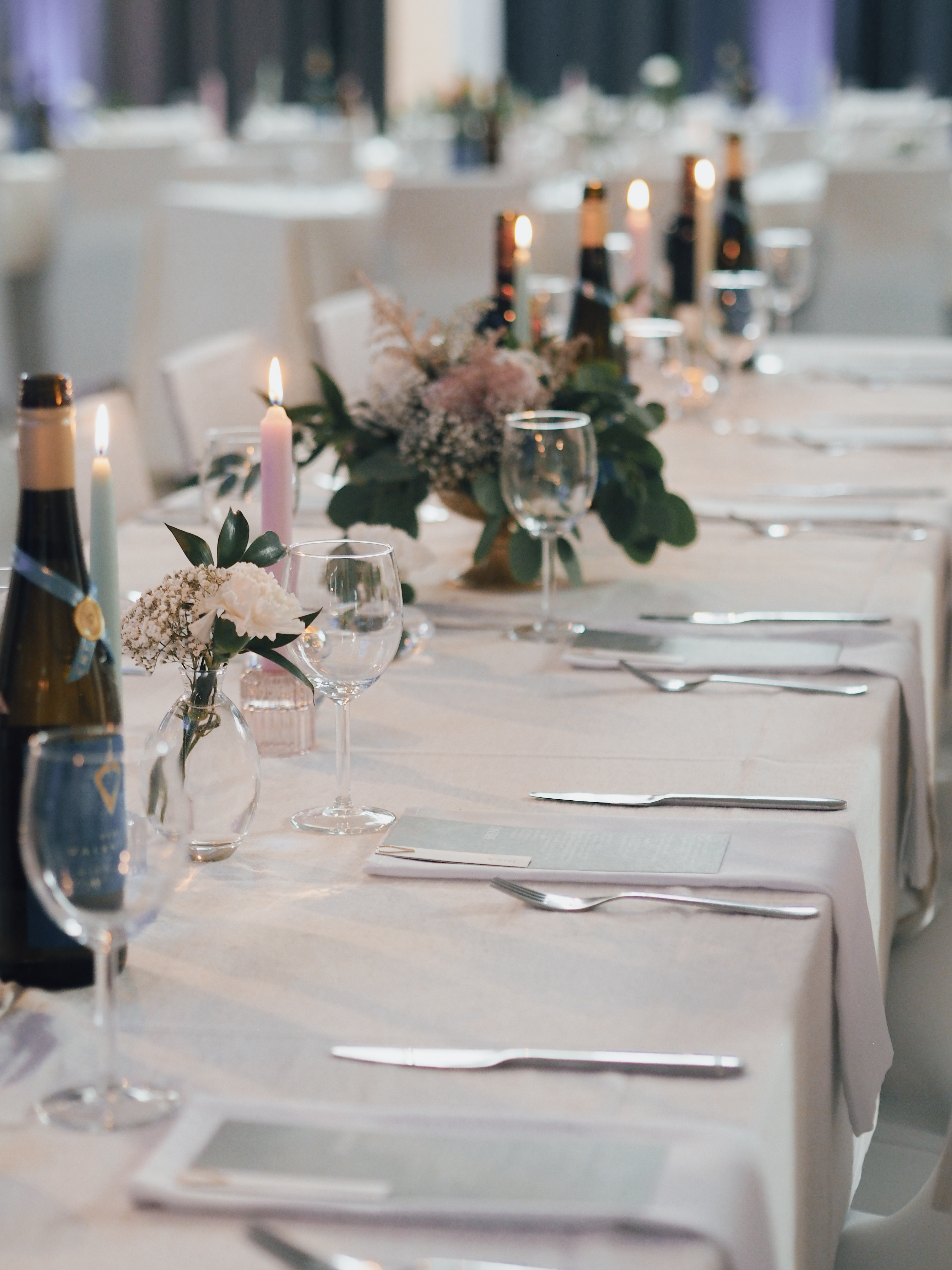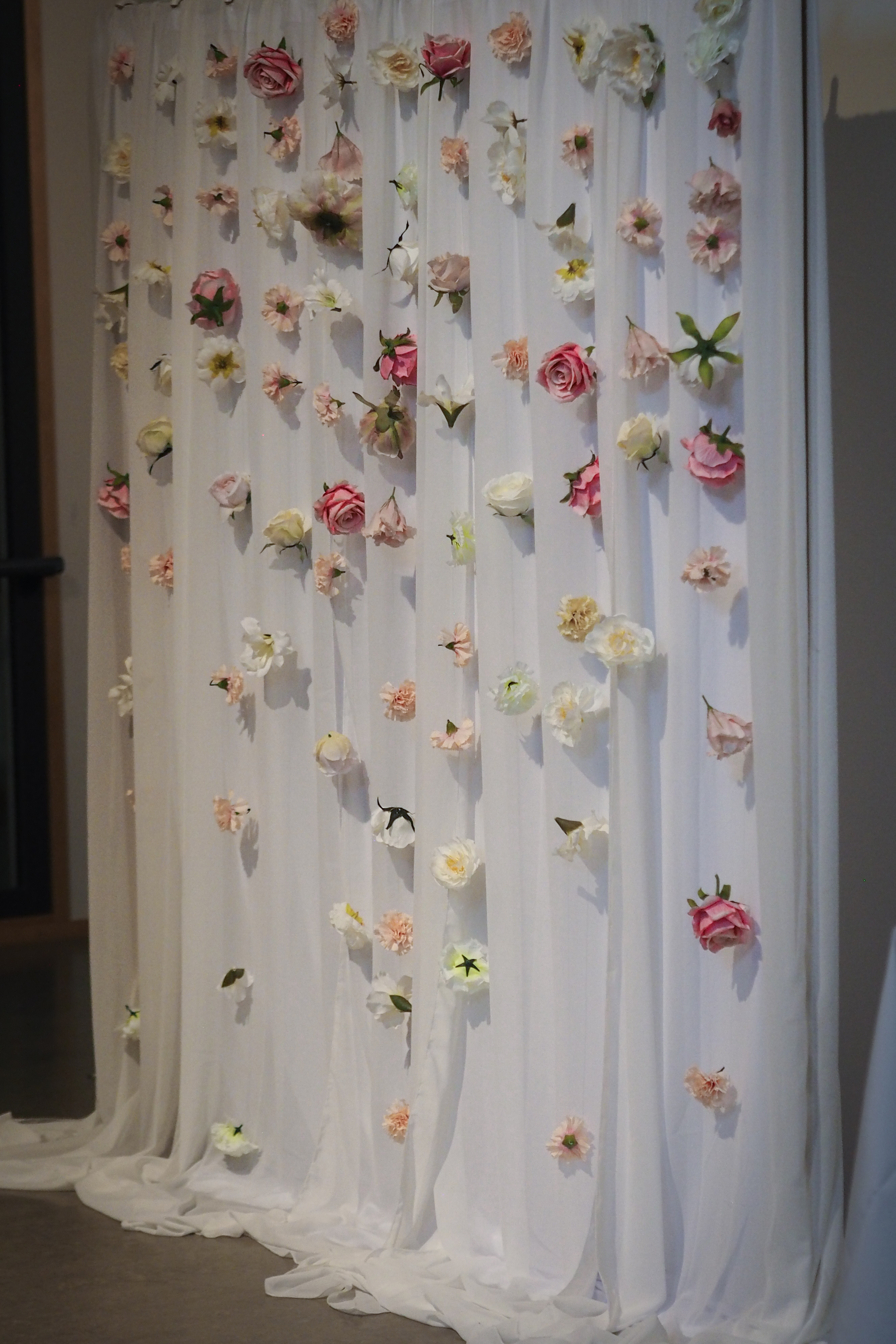 Jokioisten Tietotalon kauniiseen juhlatilaan luotiin pastellinsävyinen somistus. Luonnonmukainen kukkaisteema eli läpi juhlasalin, ja kuvausseinän herkkä leijuvat kukat-installaatio toivotti vieraat tervetulleeksi.